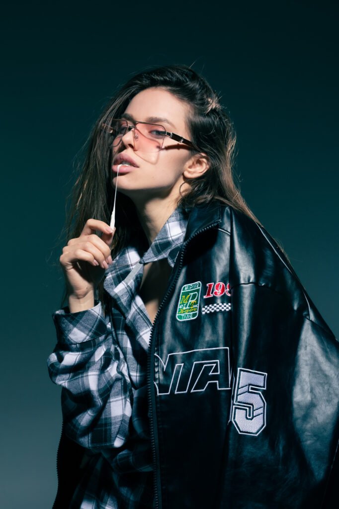 Amina@MD Professional wearing tinted sunglasses, a plaid shirt and varsity leather jacket to complete the grunge, street style look.