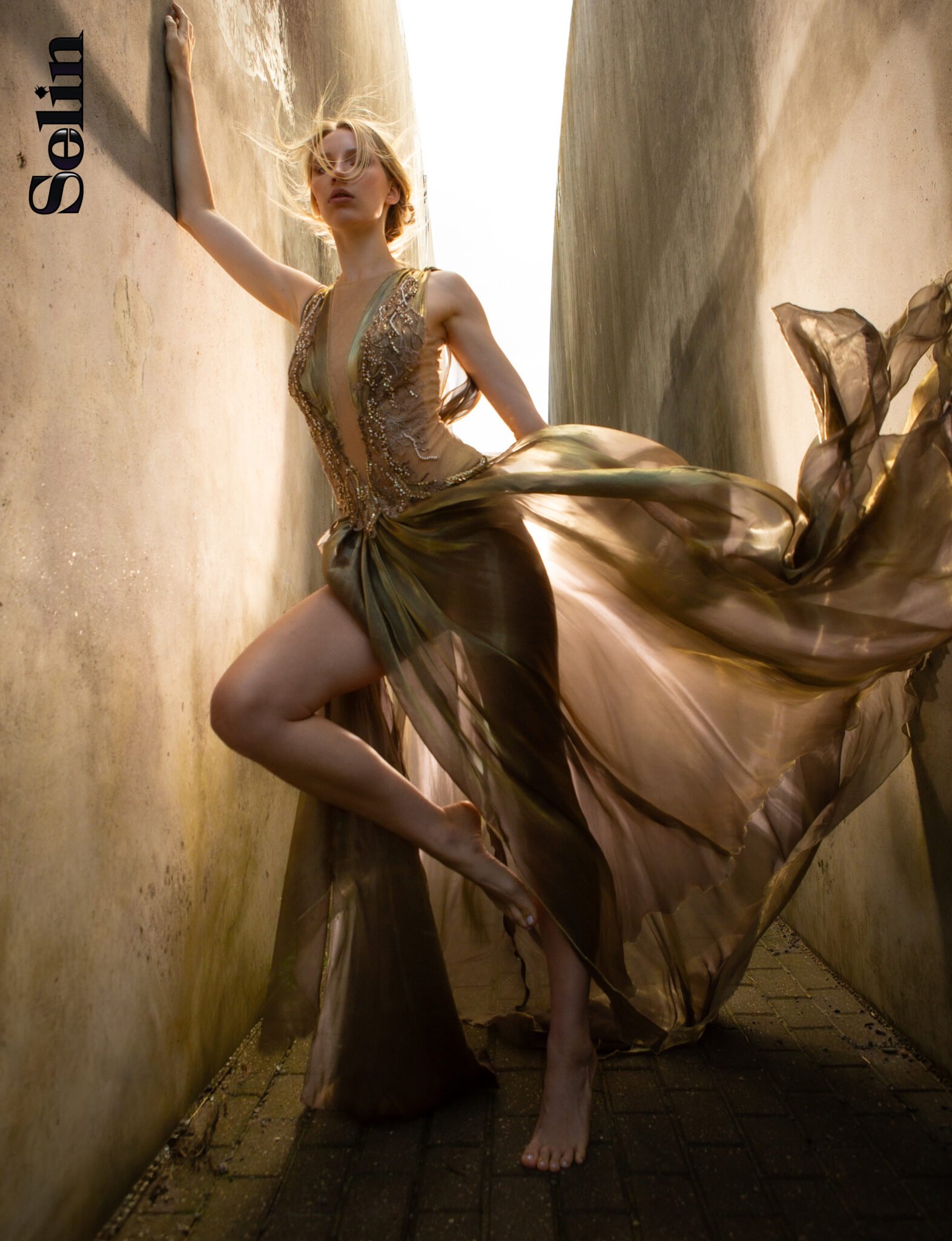 ‘As She Moves with the Wind’ captures Viktoriia Kucherenko in flowing designs by Miss Pearl Couture, with hair and make-up by Dainora Dulcyte. Set against the raw concrete forms of The Disc in Spaarnwoude, the editorial contrasts strength and softness, allowing the wind to shape each look in motion.